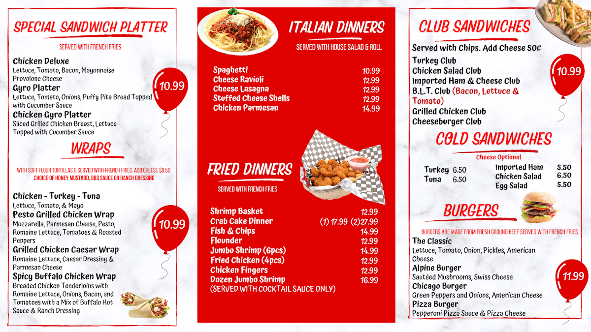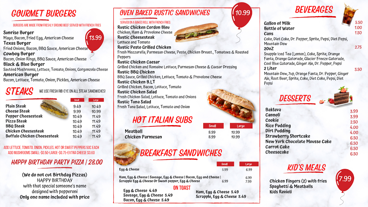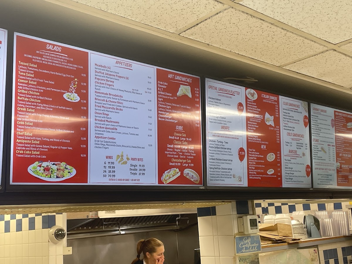 The menu features a variety of options throughout the day, starting with hearty breakfast sandwiches served on soft sub rolls or toast—perfect for a comforting morning meal. Later in the day, you’ll find comforting Italian dinners like chicken parmesan, baked lasagna, and spaghetti with meatballs, offering a homestyle feel that suits a cozy sit-down or delivery meal.